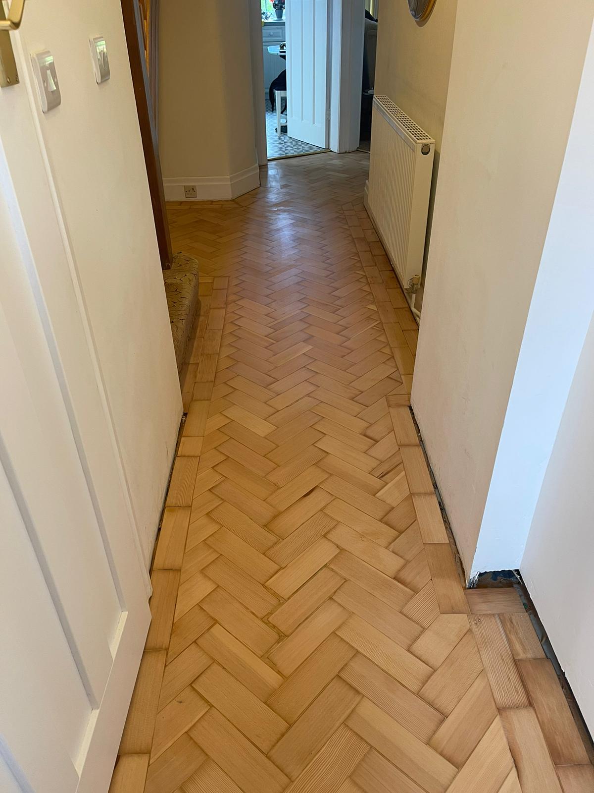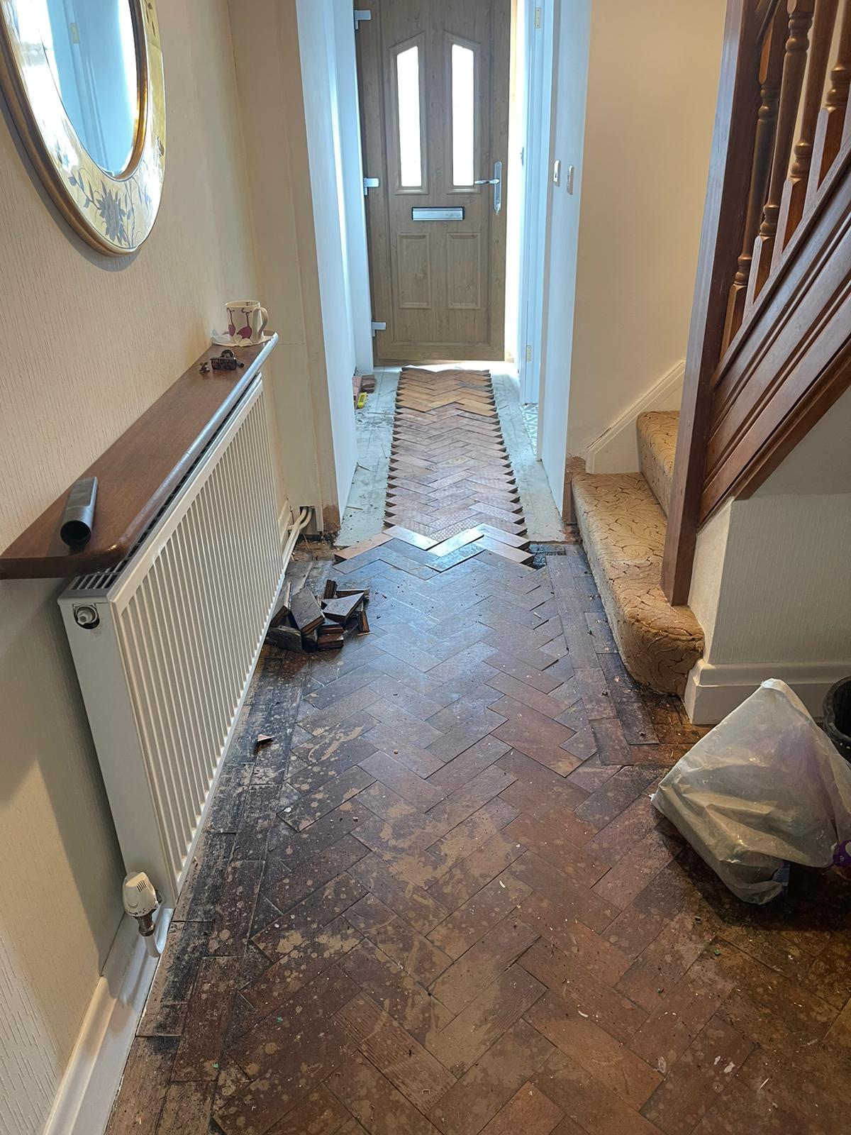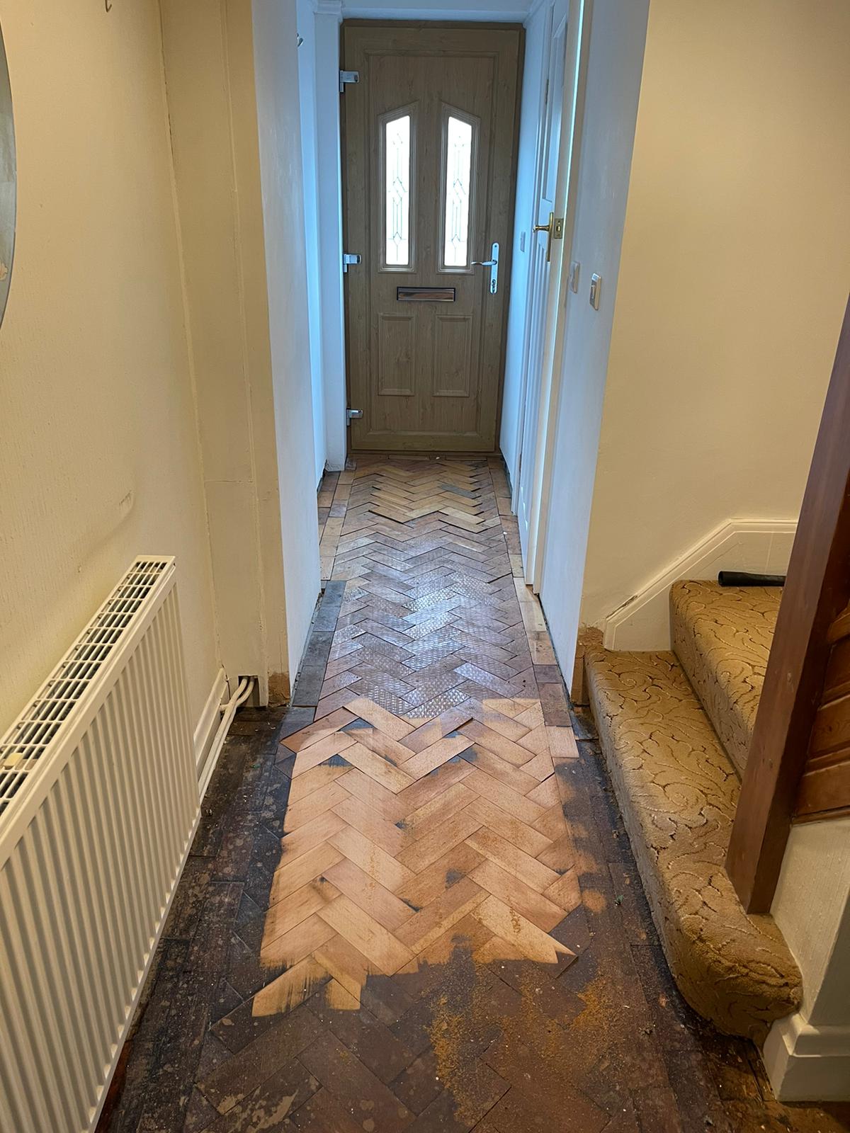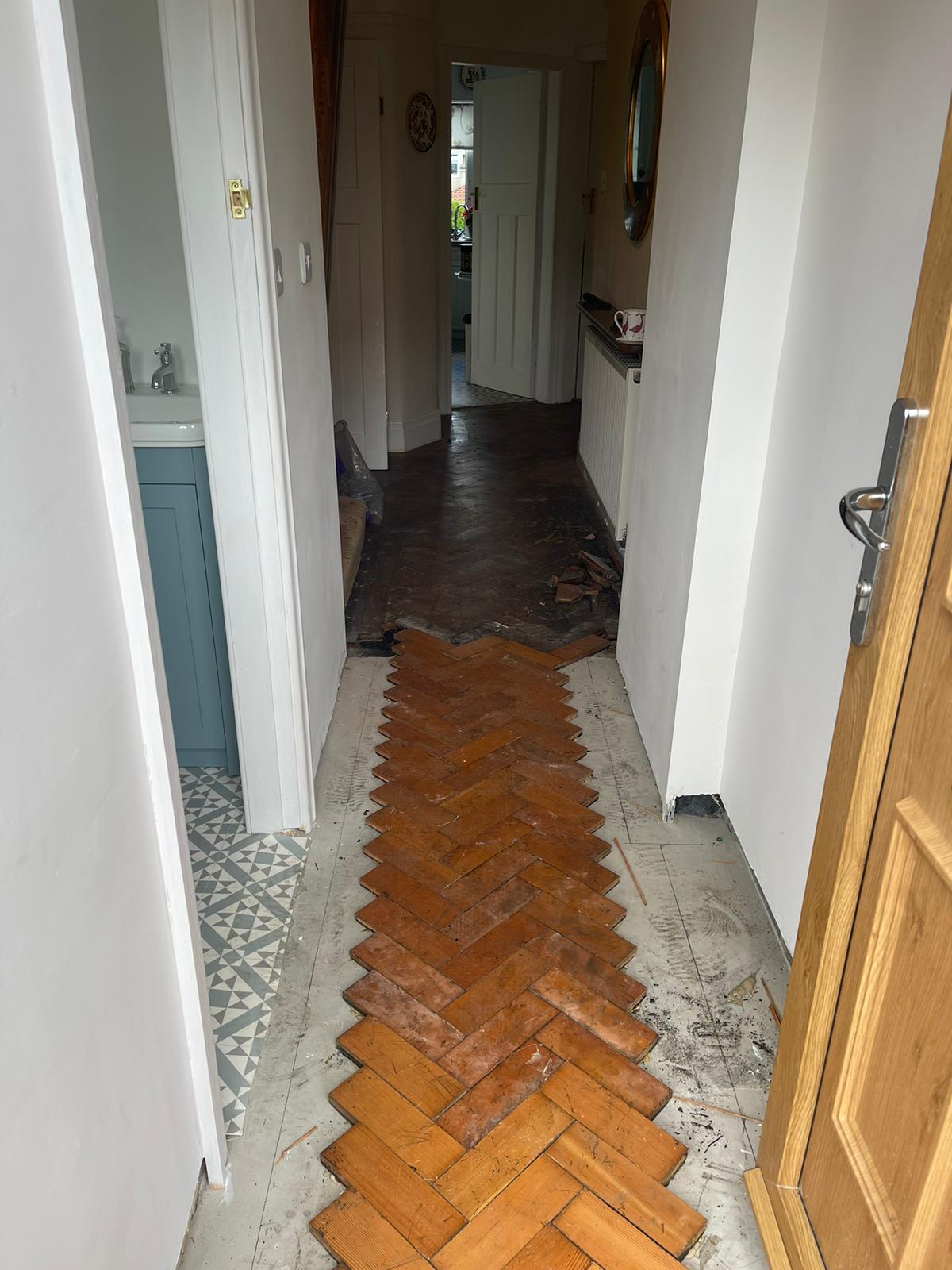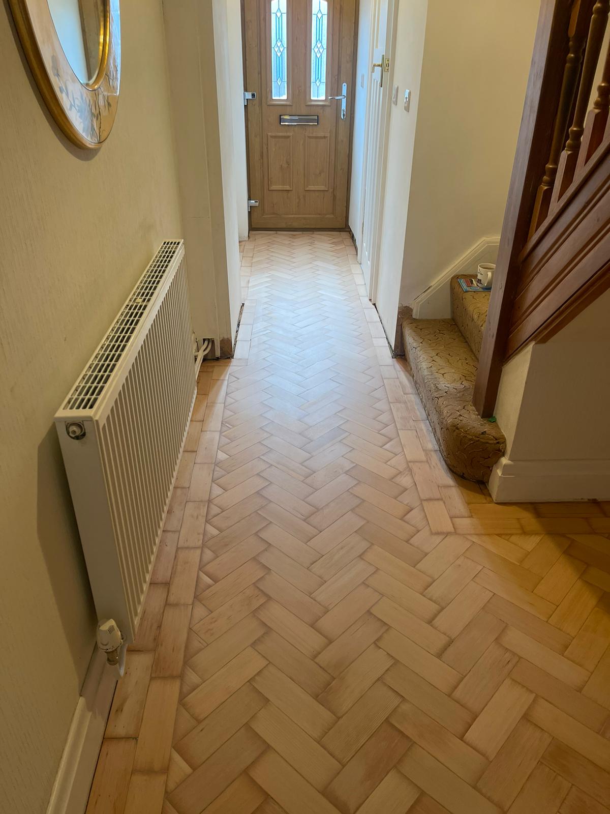 We recently restored this stunning Douglas fir woodblock herringbone floor in Wrexham, North Wales, where we extended, sanded, and finished it to bring out its full character.